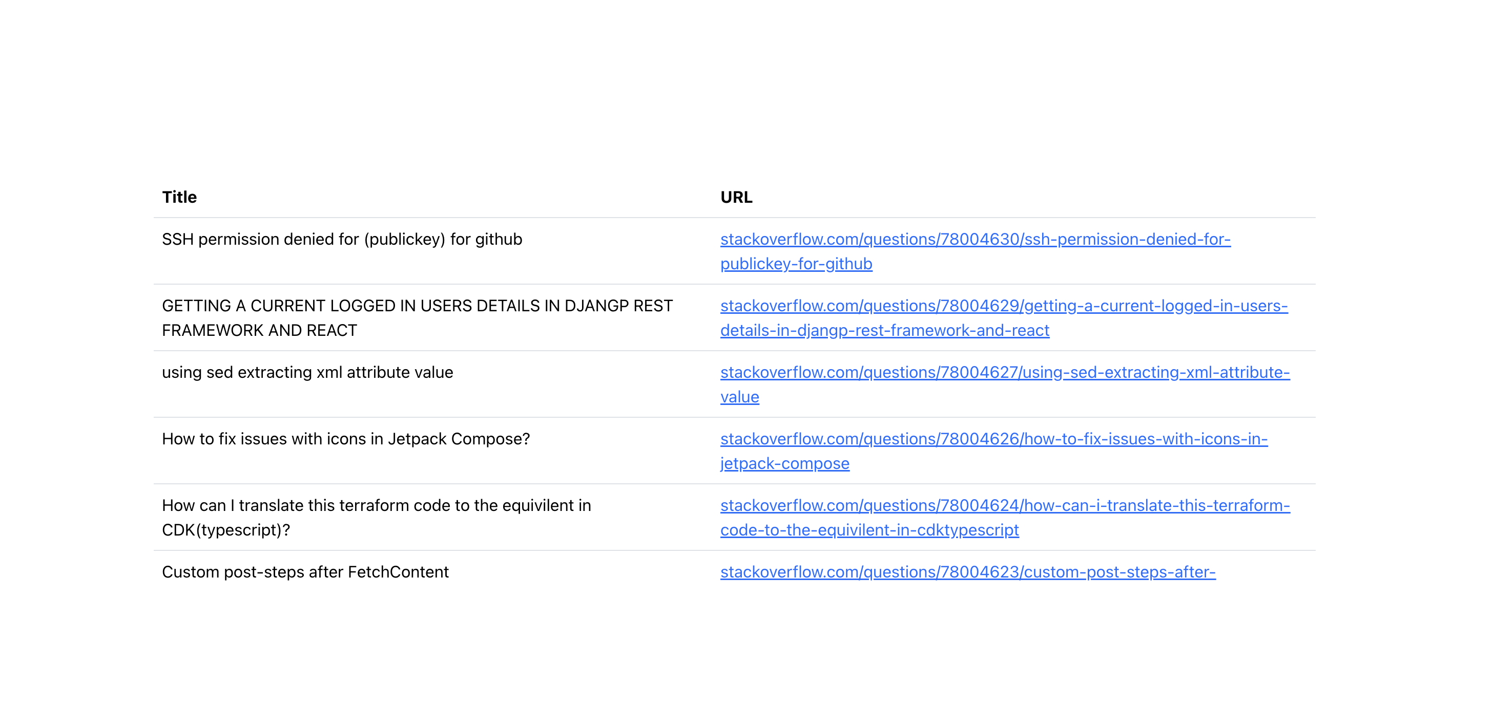 Python program to scrape data from Stack Overflow to grab top 50 new questions (question title and URL). Scraped data then stored in MongoDB database and displayed to user via React App.